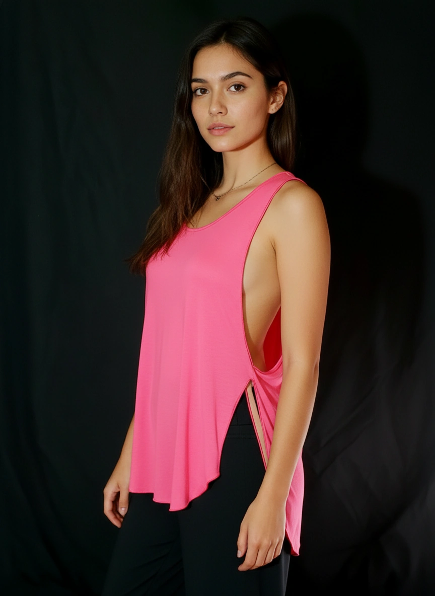 Our Sexy Open Sided Top in Semi-Sheer Jersey Fabric. Super sexy and loose fitting... this top comes in two sizes but has enough stretch to make for a perfect fit. The jersey fabric is super soft and will glide across your body while hugging every curve. It is super light weight and slightly sheer.
